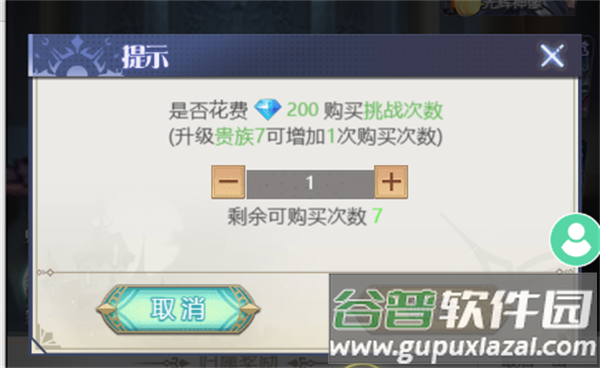 每日免费挑战次数为5次,提升贵族等级可增加次数。每次额外购买消耗200钻石,贵族6最多可购买7次。