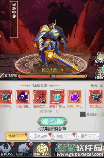 跨服首领每日总挑战次数为10次,个人初始次数为3次,次数用尽需等待恢复。