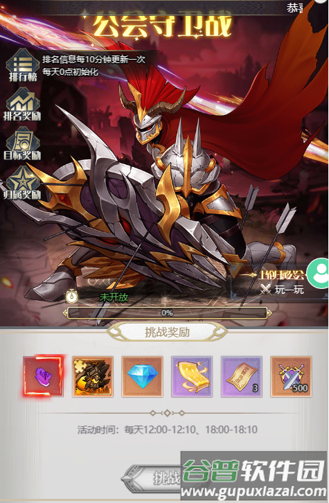 活动时间每日12:00-12:10与18:00-18:10。奖励包含挑战奖励、排名奖励、目标奖励及归属奖励,具体奖励图示如下(需已加入公会)。