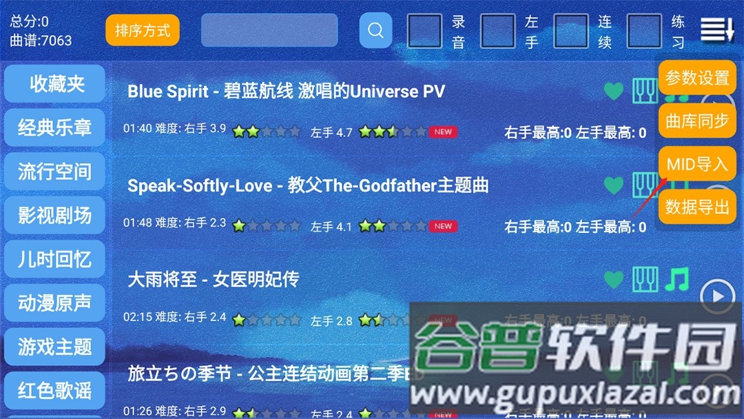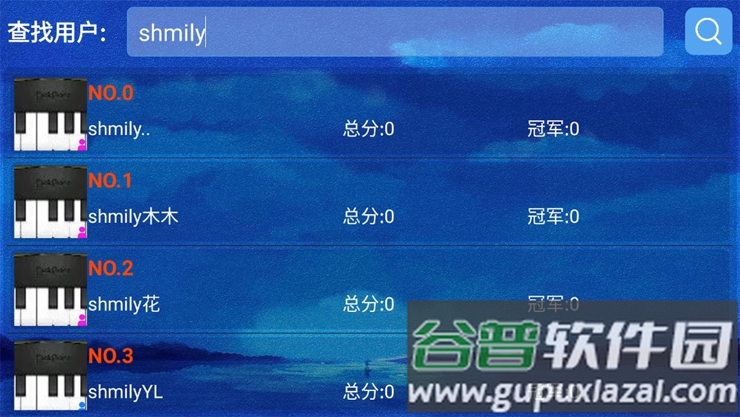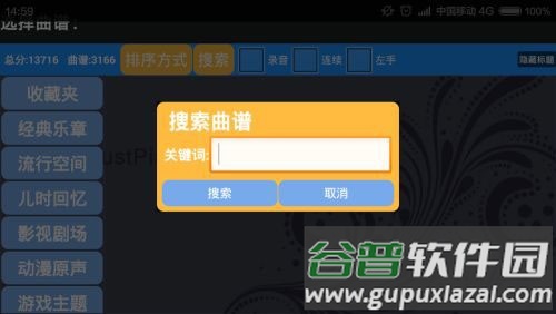 3、练习模式中,音符会在弹奏后才掉落,适合新手熟悉曲谱;点击搜索按钮,查找想弹的歌曲。