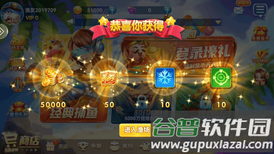 登录即享海量福利,万倍炮台可免费升级;超级首领拥有高额爆率,有机会一炮收获巨额金币。