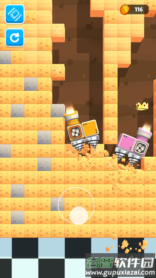 比赛双方同时向地下钻探,滑动屏幕可控制钻机移动方向;初期仅能向下钻探,通过获取配件提升性能后,移动将更加灵活;战胜对手方可赢得升级机会。
