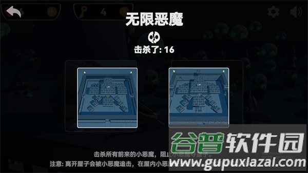 3、房间作战:巧妙利用各个房间的地形特点来制定战术,快速有效地击败所有恶魔。当你离开房屋时,会遭到小恶魔的追击;同时还需警惕骷髅头的入侵,它们能闯入屋内对你构成直接威胁。