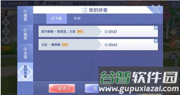 点击K歌按钮后可见大量歌曲,演唱前需先下载伴奏,成功下载的伴奏会列入个人列表;伴奏分为系统推荐、新歌、排行榜等类别,也支持导入本地音乐文件。