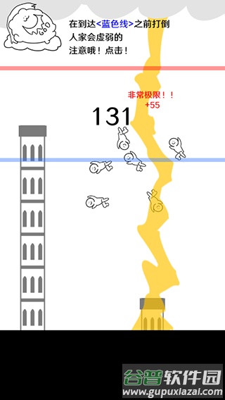 3、塔顶超过红线则游戏结束;若塔顶未达蓝线就使用天雷,雷电将进入短暂冷却阶段。