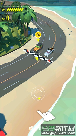 1、安装并启动游戏后,使用屏幕上的虚拟圆盘操控赛车行进方向;