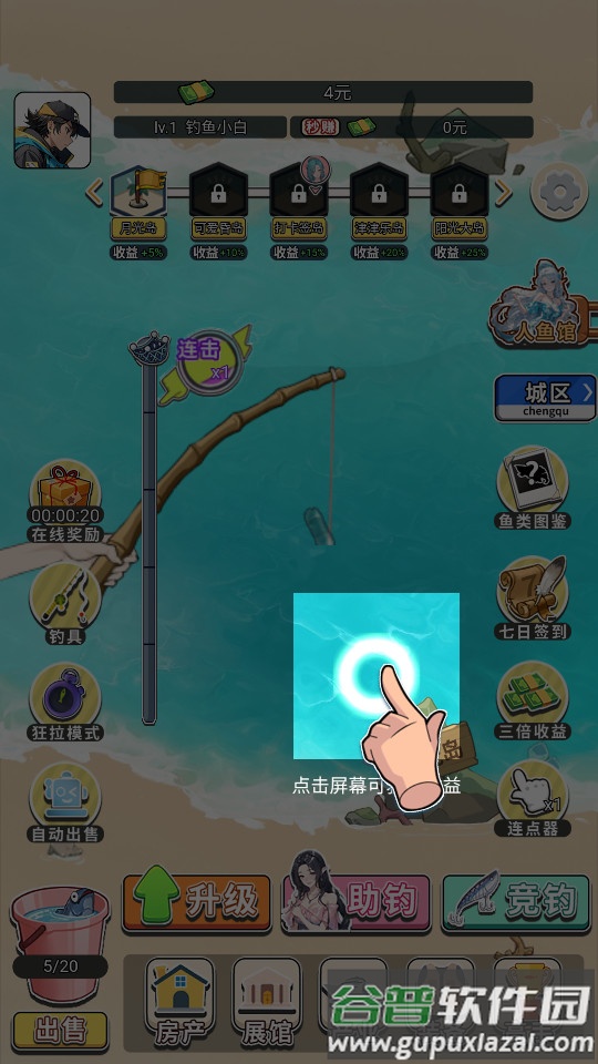 1.通过简单点击屏幕即可将鱼竿抛入水中,成功钓起鱼类后可获得相应金币奖励。
