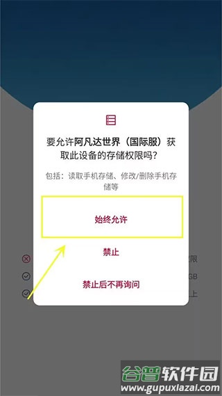 1.打开已安装的游戏,会出现安装器界面,此时提示需要储存权限,点击始终允许。
