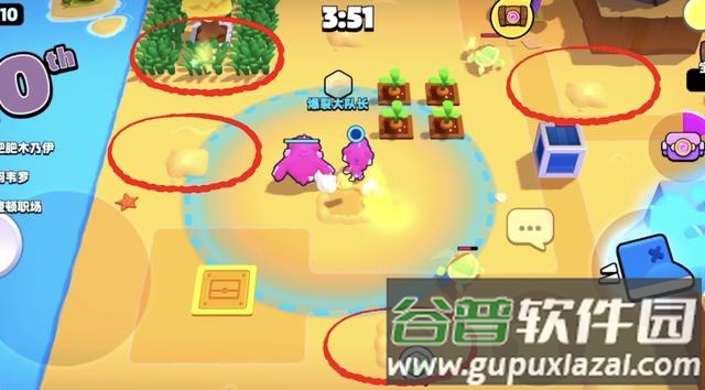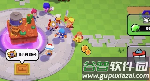 地图上散布着多种资源。蓝色宝箱在出生点必定出现,击碎后除了金币宝石,还会掉落加速鞋;这个道具非常重要。蓝色宝箱数量有限,不会刷新,开局后应尽快抢占。