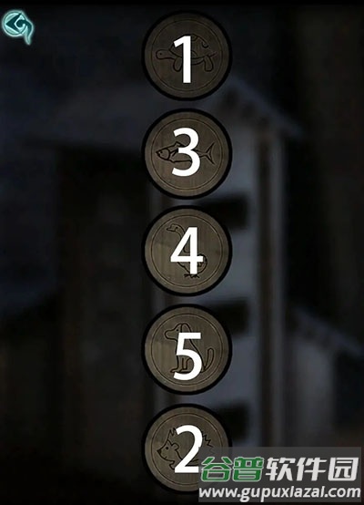 观察左侧小型房屋装置,侧面绘有五种动物;结合谜语推断顺序为龟、刺猬、鱼、大白鹅、狗;按此顺序点击机关,弹出一方砚台。