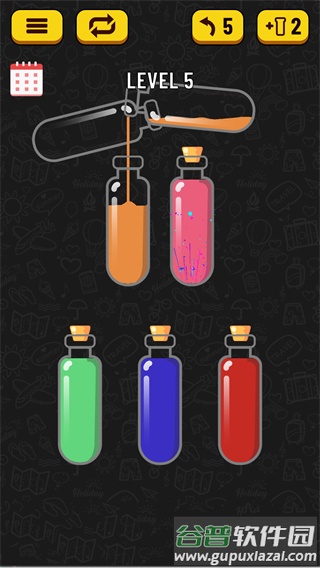 2、直到所有同色液体都进入同一瓶子,便算成功过关;规则与操作都很简明,可以随时重新开始关卡;