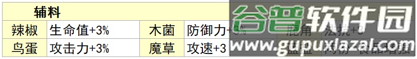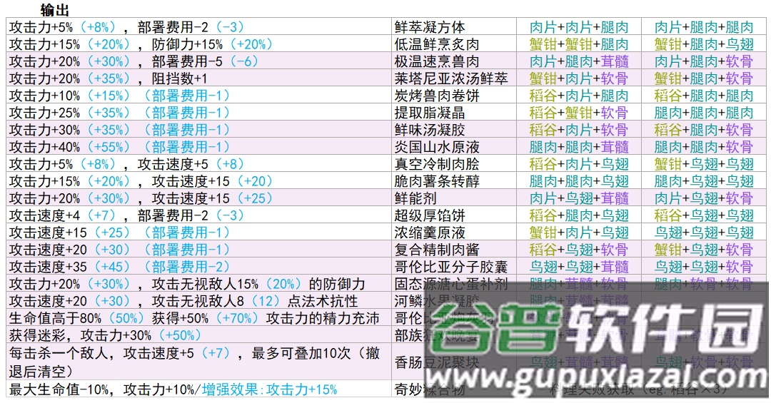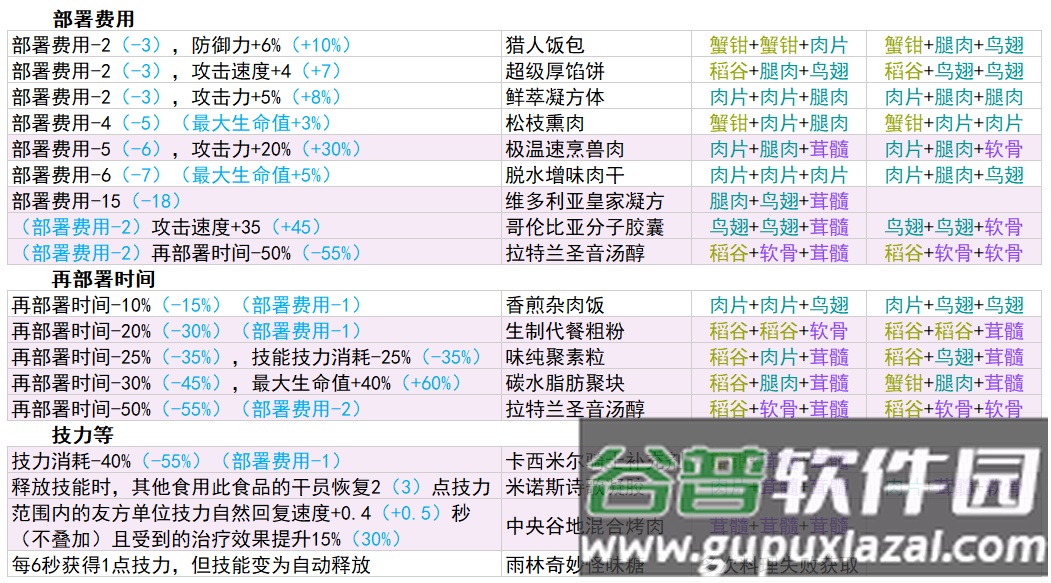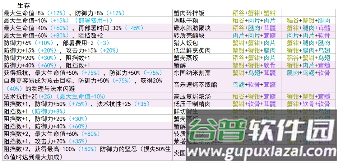 图中蓝色文字代表在辅料栏添加两份调味料(蓝盐)后获得的β版本菜肴,紫色底纹则需要使用鹿肉或龟肉等高级食材。