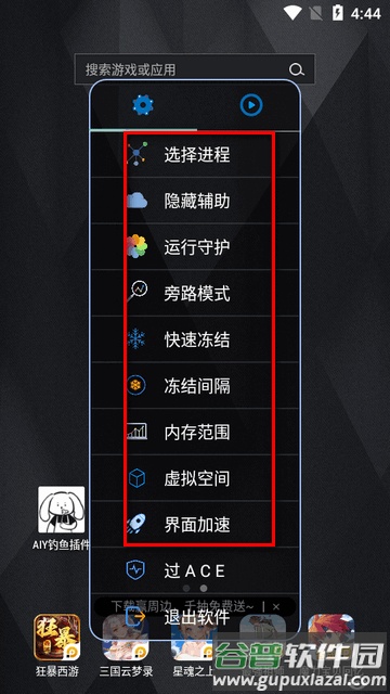 选择进程;隐藏辅助;运行守护;旁路模式;快速冻结;冻结间隔;内存范围;虚拟空间;界面加速;过ACE。