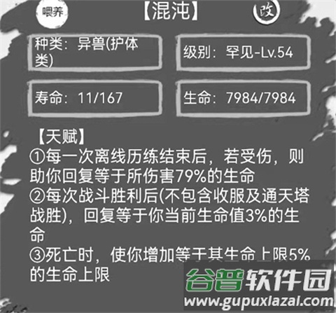 获得混沌后,即可实现修为与斗煌持无限增长;混沌拥有战斗回血被动,胜利后系统恢复其百分之二十五生命,自身血量约八千点,使其成为可持续作战的强力伙伴;