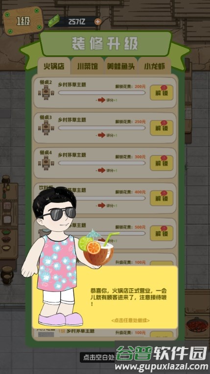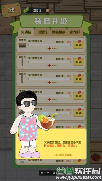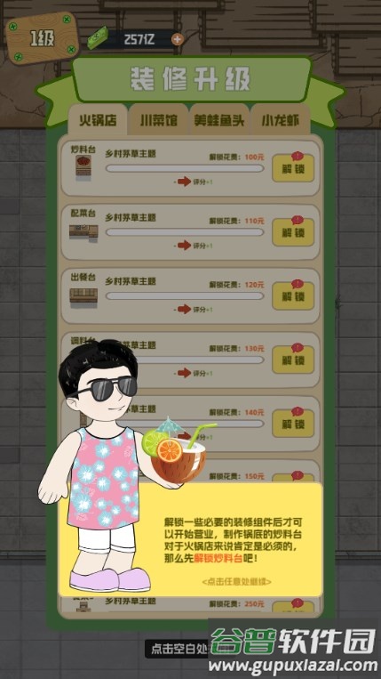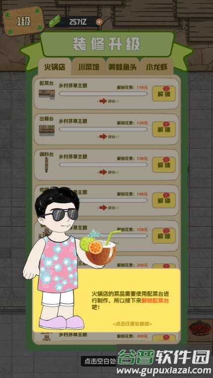 4、必须解锁几样核心设施才能开门迎客。炒料台是制作火锅底料的关键,因此优先将其解锁。