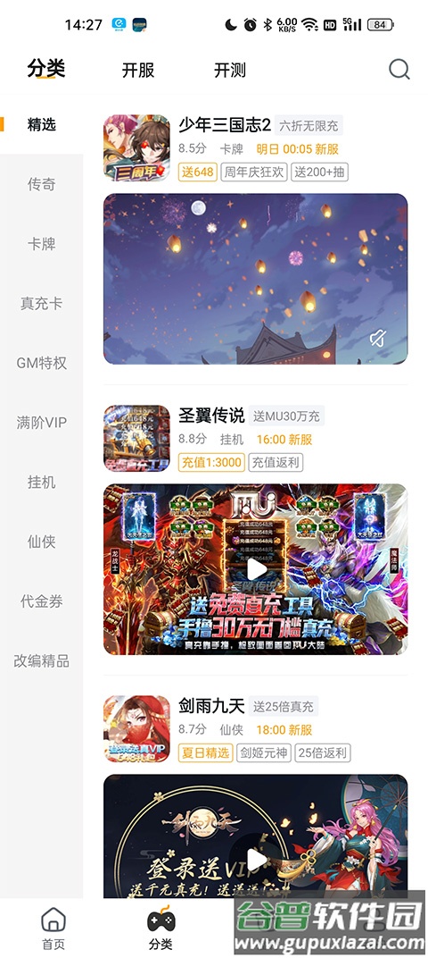 3、分类:游戏按精选、传奇、卡牌、真充卡、gm特权、仙侠等类别划分,方便用户按喜好挑选。