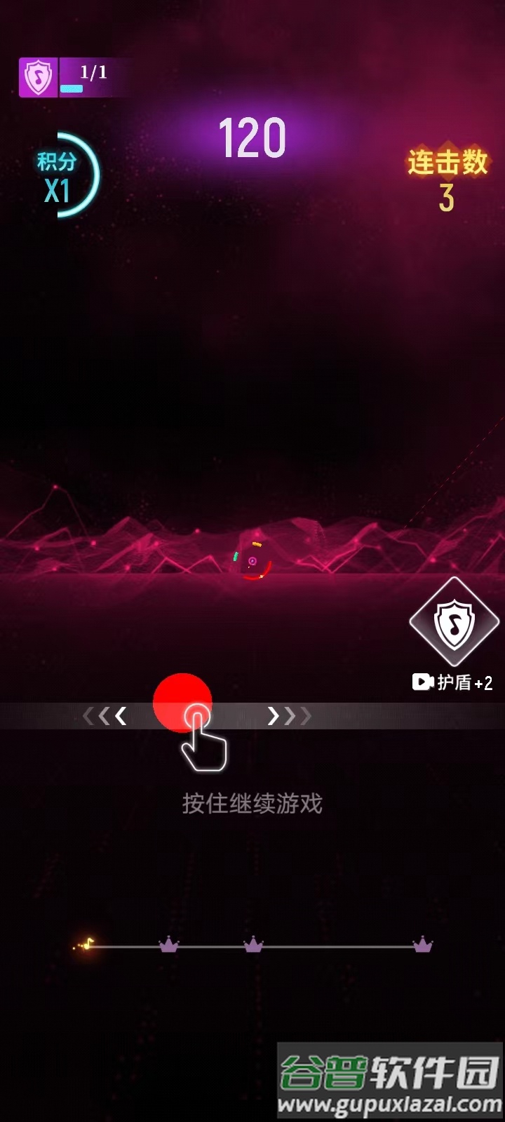 7、具体玩法是按住屏幕上的圆点,向左或向右滑动,击打前方红色亮线最闪耀的位置;连续命中次数越多,得到的积分就越高。