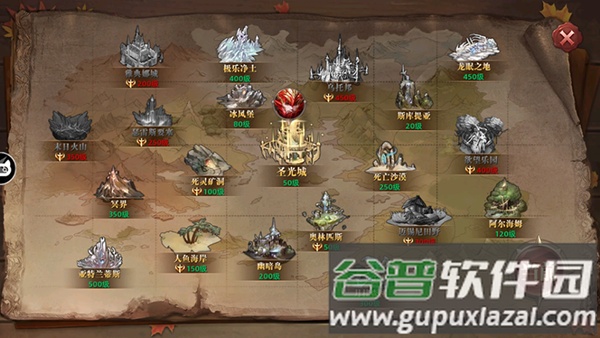 世界地图界面展示全部已开放地图及其等级信息;已解锁的地图可直接点击查看详情;部分场景图标附有传送标志,使用传送卷轴可快速抵达。