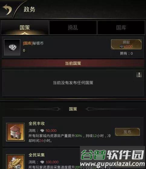 任命国王后,国王可为其他玩家授予官职,官职分为提供正面效果与负面效果两类。王座还提供三种不同等级的礼包,每种等级数量有限;国王可将礼包赏赐给本盟成员;封赏礼包仅在祝福阶段发放,该阶段结束后无法分配,但玩家仍可进入界面查看奖励与封赏记录。国王在位期间,本王国玩家每日采集量的百分之三十将作为税收缴纳至国库,此税收不影响玩家实际采集收入。在跨服王座争夺战中获胜的王国,可向战败王国征收其百分之三十的采集税收。国库资源可累积储存,国王拥有分配权。王国所有领主捐献的秘银币将进入国库,国王可通过消耗秘银币发布国策。首次开启王座争夺战后,每日任务可获得秘银币。同时只能发布一条增益类国策。秘银币捐献仅限王座祝福阶段进行;该阶段结束后,将依据捐献排行榜发放奖励。