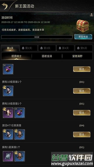 新王国活动每日解锁全新任务页签;完成指定任务即可领取丰厚奖励。活动收官时设有专属宝箱,奖励等级依据玩家累计完成的任务数量而定。务必尽力完成所有任务,以获取最高档位奖励,包含两万金币、五十小时加速等珍贵道具,能有效助力前期发展,建立领先优势。