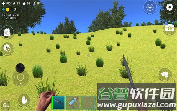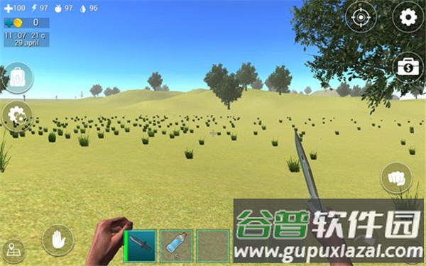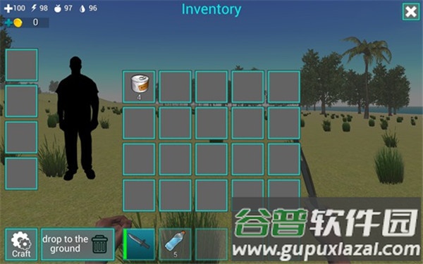 3、屏幕下方道具栏存放着一把匕首与五瓶水,点击匕首即可装备。界面左上角四个图标分别代表生命值、体力状态、饥饿度与口渴程度。