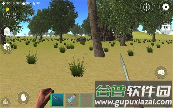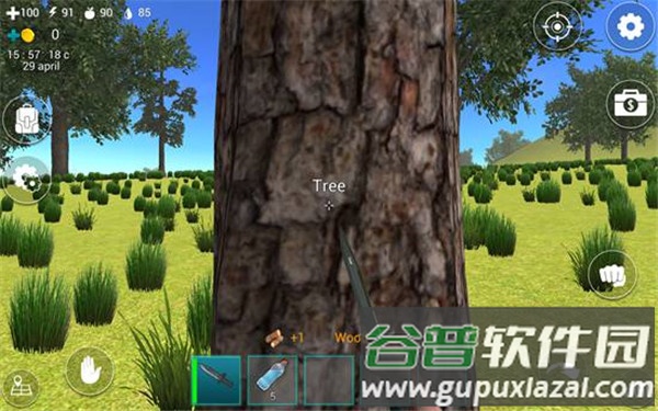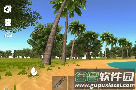 8、沿海岸线朝水塔方向前进,途中可使用匕首对准树木,点击右侧攻击按钮获取木材,这是后期建造与制作的重要材料。