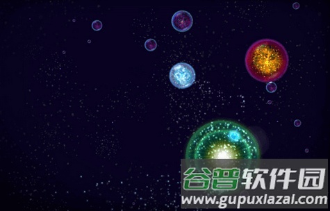 2、玩家控制的球体通过点击一侧喷射气泡,朝反方向移动;点击越快移动越迅速,但星球也会缩小更快,需利用此惯性进行游戏。
