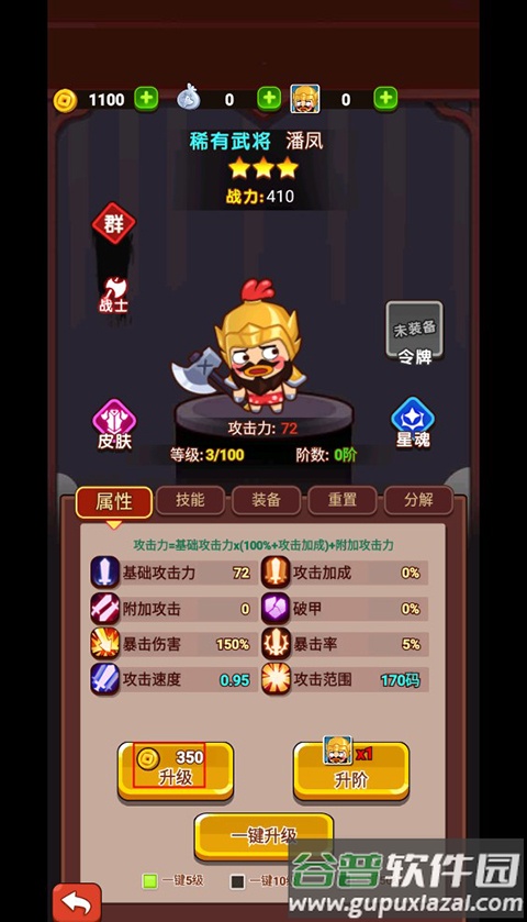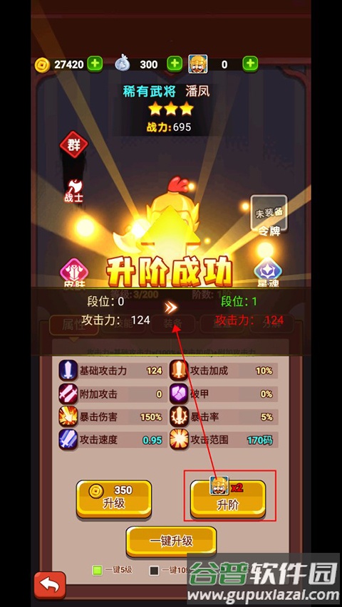 3、武将可通过消耗金币进行升级;提升等级后,基础属性与战斗力将随之增长。