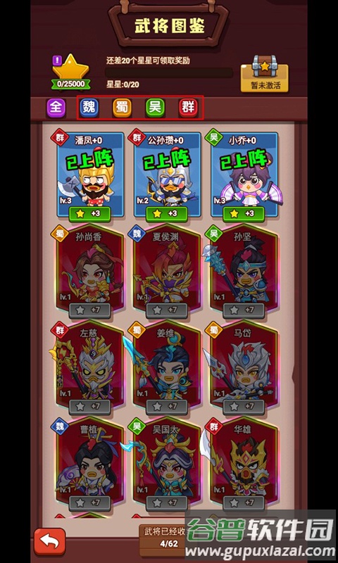 1、武将分为魏、蜀、吴、群四大阵营,以及战、射、策三种职业;收集武将可激活图鉴,领取宝箱奖励。