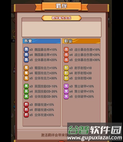 2、阵营与职业存在羁绊效果;上阵相同阵营或职业的武将,能够激活额外属性加成。