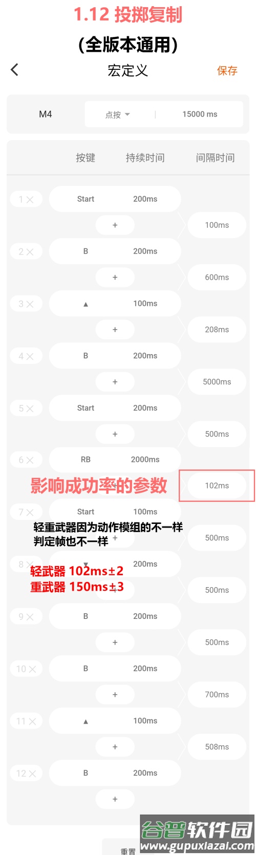 ②、单手与双手武器的动作模组不同,武器脱手的判定帧也有差异,因此需选用对应的宏,具体参数调整已标注在图片中。