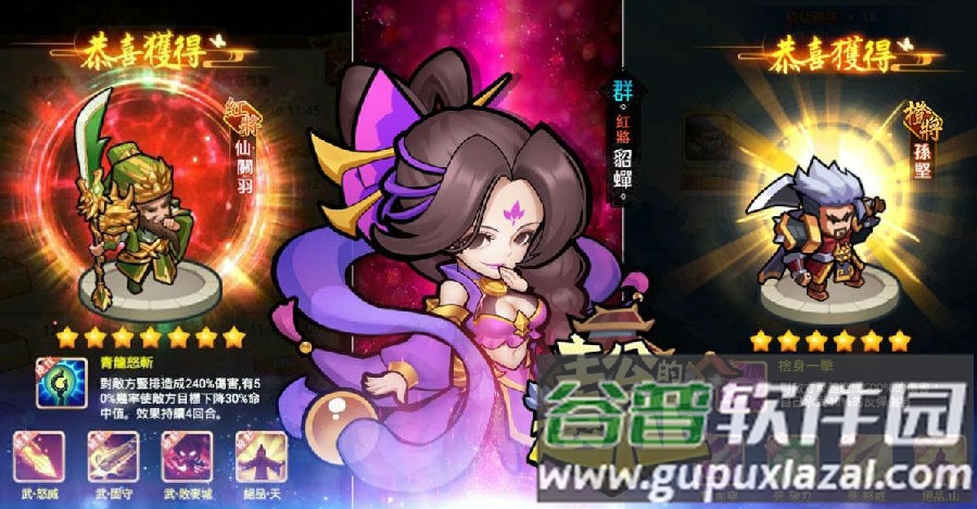 3、快速成军,红将、橙将、黄将等上百位名将轻松纳入麾下;游戏中没有无用卡牌,普通小兵也能培养出神将,三国逆袭近在眼前。