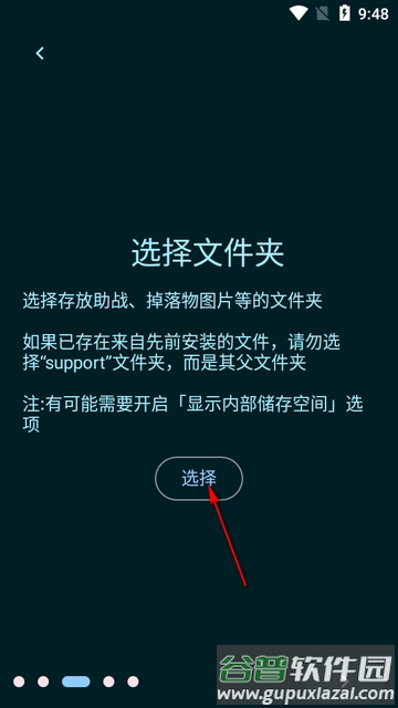 请指定用于存放助战角色、掉落物品截图等资料的文件夹;若之前安装已存在相关文件,注意不要直接选择“support”子文件夹,而应指定其上一级目录;部分设备可能需要开启“显示内部存储空间”选项才能正常识别。