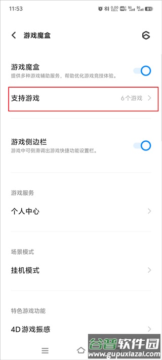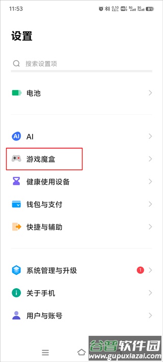 1、首先打开手机设置,下滑找到“游戏魔盒”;