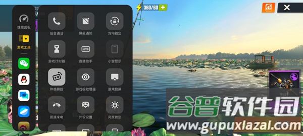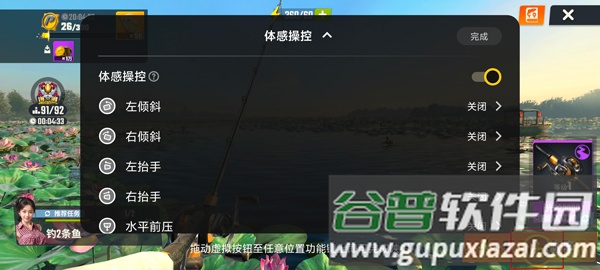 4、添加后启动游戏,点击“去钓鱼”,进入渔场内,左侧滑动屏幕,开启游戏工具,点击“体感操控”;