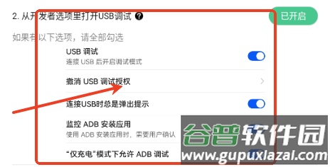 4、在开发者选项中启用USB调试,并将页面内列出的四个相关选项全部勾选;