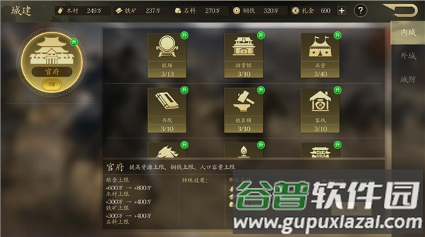 优先提升官府、书院及校场的等级。书院科技方面,着重研究抛射技术、车轮技巧、战斗技巧、统帅能力、防护技术以及驾驭和行军技巧。这些升级能直接增强整体战力。初期可侧重提升将领的勇武属性,以降低攻城时的阻力。