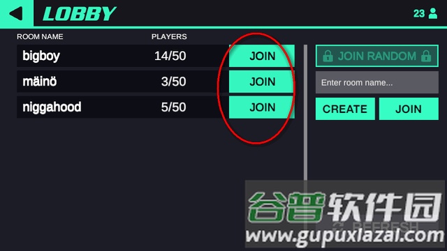 3、进入联机大厅后,左侧列表显示现有房间,点击“join”即可加入;若想自己主持,点击右侧“create”按钮即可创建新房间。