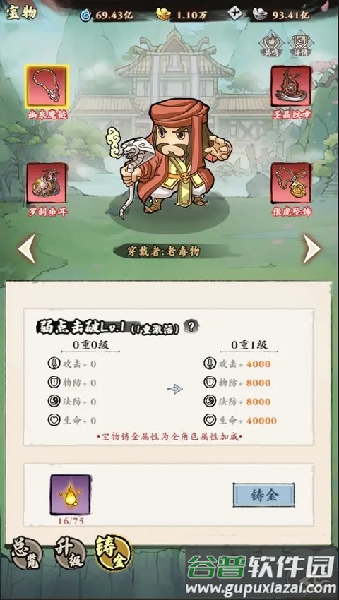 二、宝物提升攻略:宝物升级带来巨大的属性提升,是宝物加成的关键;升级可同时提高基础属性与特定属性,等级越高加成越多;升级需要宝物碎片,主要通过天机阁、宝物活动等途径获取;铸金玩法仅限红色品质宝物,每阶段消耗对应材料进行提升。
