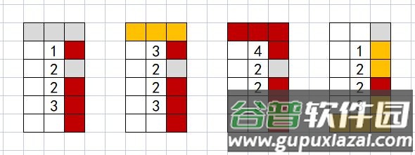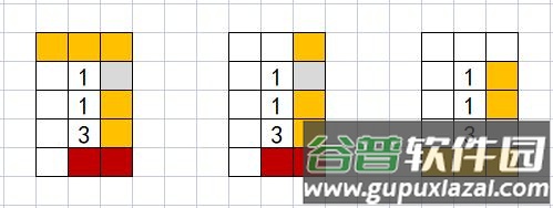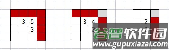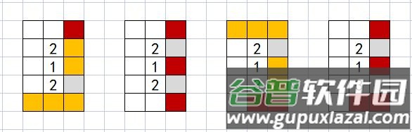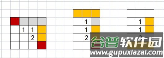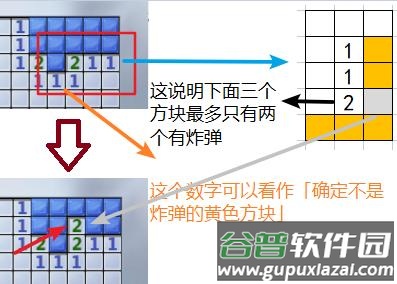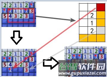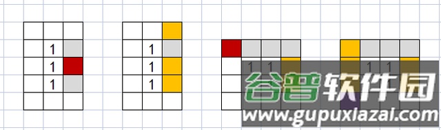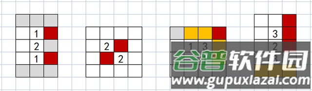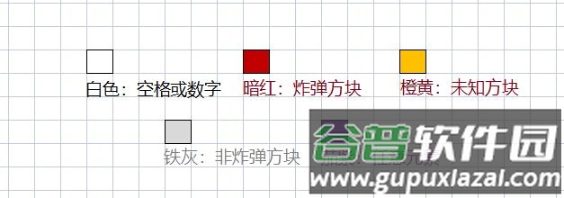 说明:红色方块一定是炸弹;白色区域绝对安全;黄色方块可能有炸弹,确认安全后可视为白色;灰色绝非炸弹,必要时也可看作白色;紫色区域内容可忽略。可将已确认炸弹视为空格,使周围数字相应减小以匹配阵型。