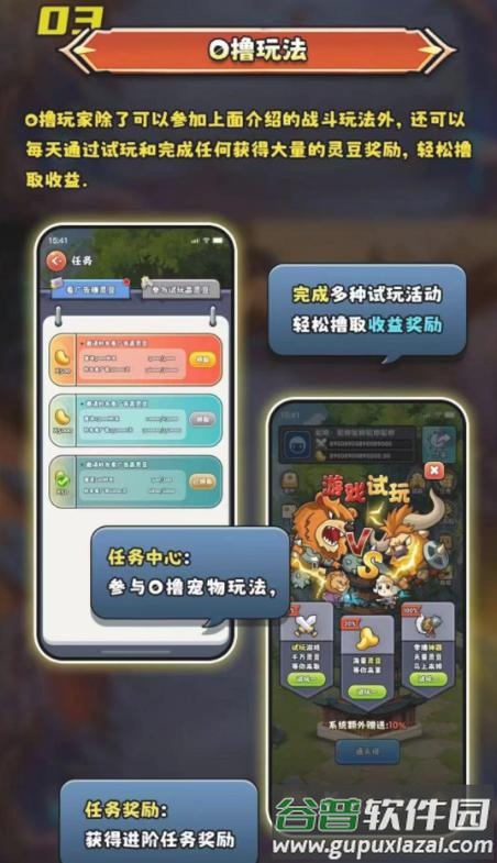 一款采用新式玩法的战场养成游戏,模式类似寻荒一梦;平台接入了广告与游戏试玩功能。玩家通过收集养成稀有宠物和装备来提升战斗力,并可升级个人家园。刷新领地资源可采集各类材料,游戏试玩与材料出售均可获得灵豆;550灵豆可兑换1个大饼用于转赠或变现。游戏还包含PVP对战、通天塔PVE、公会战、领地争夺等玩法。