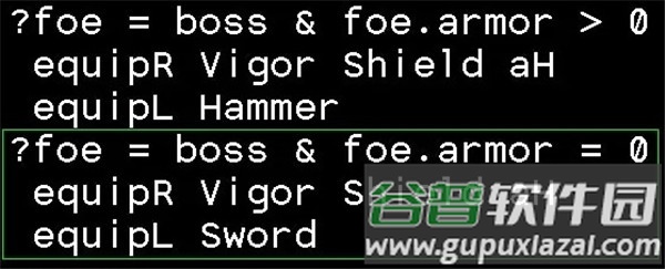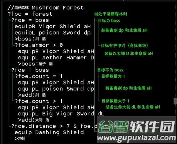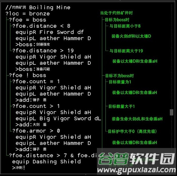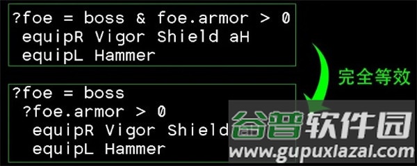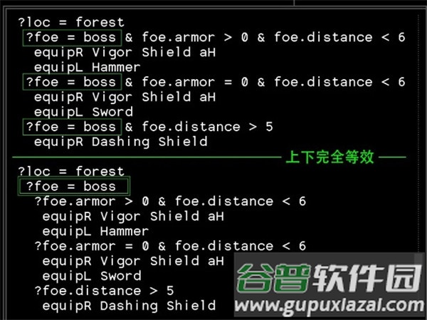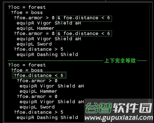 将多个代码段里重复的条件提取为主条件,可大幅简化文本;例如先将loc=forest设为主条件,再逐步纳入foe=boss、foe.distance<6等次级条件,最终得到条理分明的代码块。