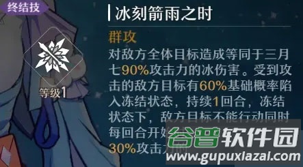 三月七为四星存护命途冰属性角色。战技可基于自身防御力生成护盾;终结技有一定概率冻结敌人。