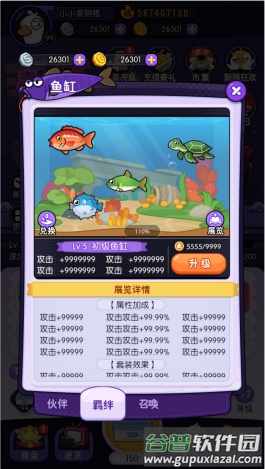 鱼缸养成涉及鱼缸升级、鱼类合成、鱼类展览、鱼类兑换与鱼类图谱;