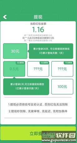 3、累计登录满20天,可直接提现30元现金至微信账户。