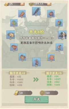 7.装备开光:消耗开光符与升阶符对装备进行精炼,提升所有装备的基础属性;当装备精炼阶级达到特定条件时,可激活合鸣效果,带来道行的额外增长。