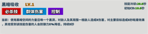 召唤黑洞,对目标及其周围一格内的敌人造成伤害;主要目标会被眩晕,其他受击敌人防御力下降。
