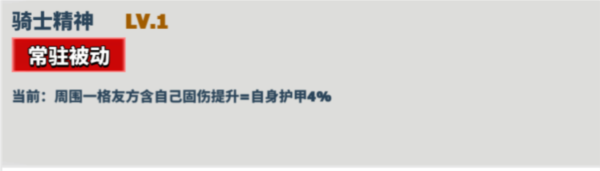 提升周围一格内友方单位(包括自己)的固定伤害,提升数值相当于自身护甲值的特定比例。