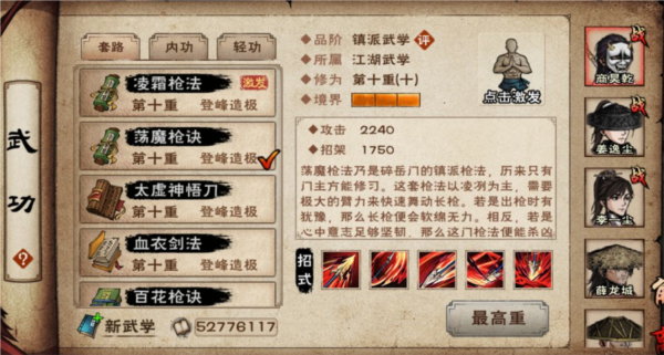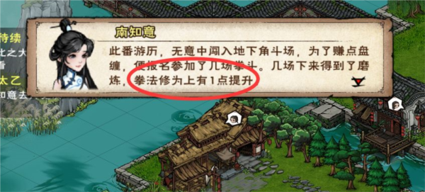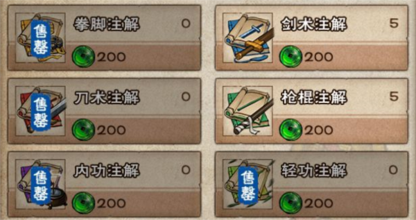 3、武馆木桩练习:主角使用不同武器攻击武馆门前的木桩,每次可获得对应套路修为1点,每种套路通过此方式最多获取50点;