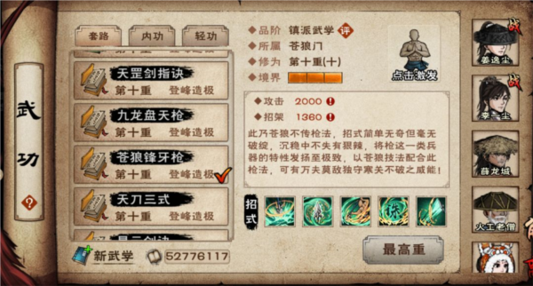 9、苍狼门指点:拜入苍狼门后,每日可在凌枫处获得2点枪棍修为。枪棍修为达到250点并成为苍狼铁卫后,可挑战成为教头,每日额外获得8点。两种方式共享200点上限;